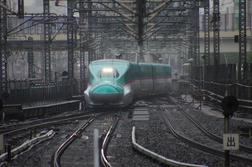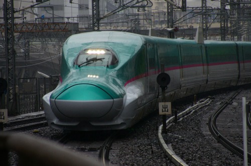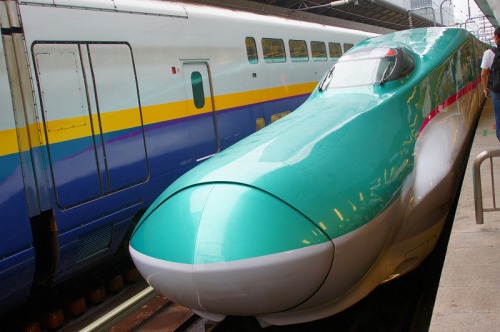 E5系電車はやぶさは今年3月5日に デビュー 東北新幹線最速列車である E2系電車「はやて」 「やまびこ」の275km/hを上回る、 最高速度320km/h (運行開始時は300km/h)での 営業運転を行う 東京新青森間を最短3時間10分 で結びます。 |