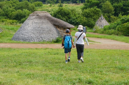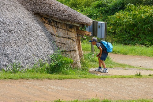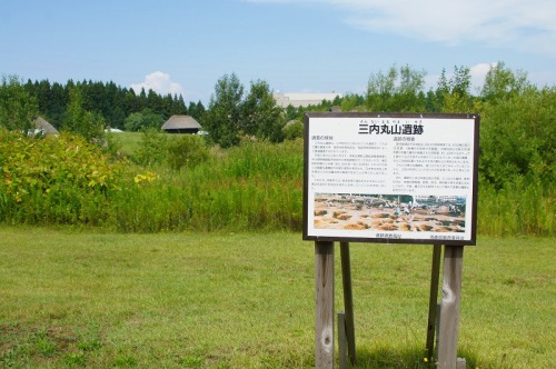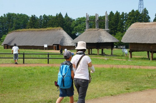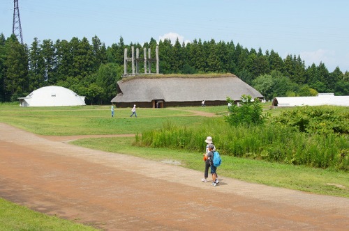遺跡めぐりスタートです。 三内丸山遺跡は、今から 約5500年前~4000年前の 縄文時代の集落跡で、 長期間にわたって 定住生活が営まれていました。 |