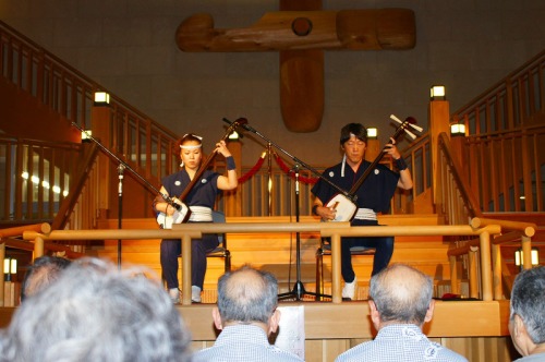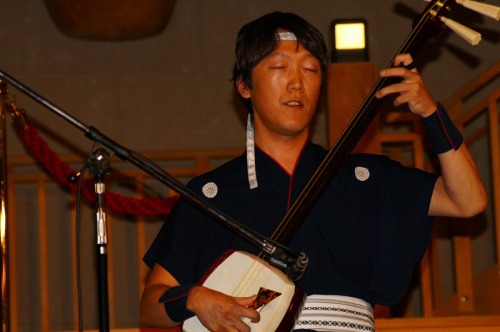 この浅虫温泉では浅虫最大の温泉ホテル海扇閣 で毎日無料で津軽三味線のライブが聴けます。 何処の旅館から聴きに行ってもOKです。 この2人は結構お上手でしたよ。 |