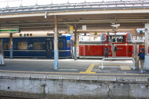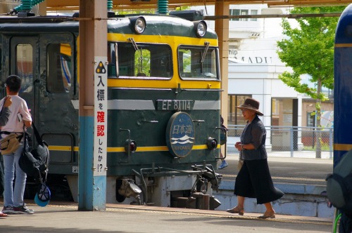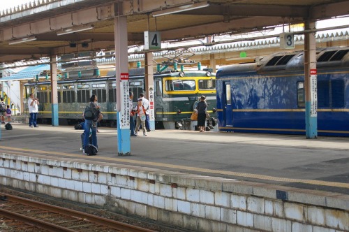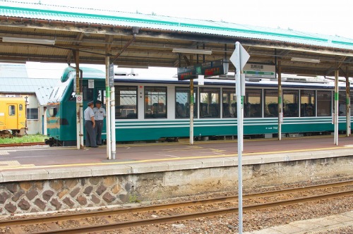 青森駅ホームです。 この先は津軽海峡でこの右側に 八甲田丸が保存されています。 五所川原へ向かうべく奥羽本線、五能線経由秋田行きを待っていると、寝台夜行列車の 日本海が到着しました。 |