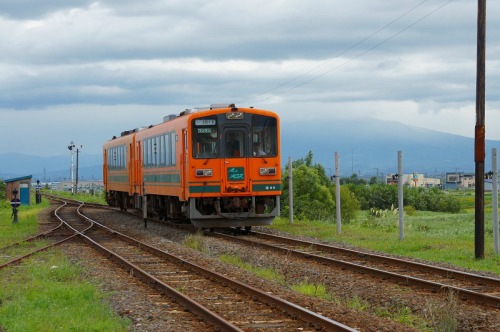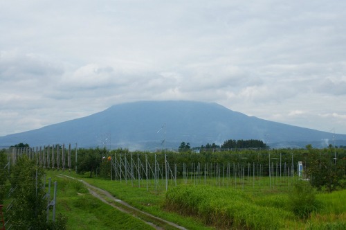奥羽本線は川部というところで 五能線と分かれます。 川部からはディゼルです。 岩木山が見られましたが、残念ながら頂上は雲の中でした。 |
