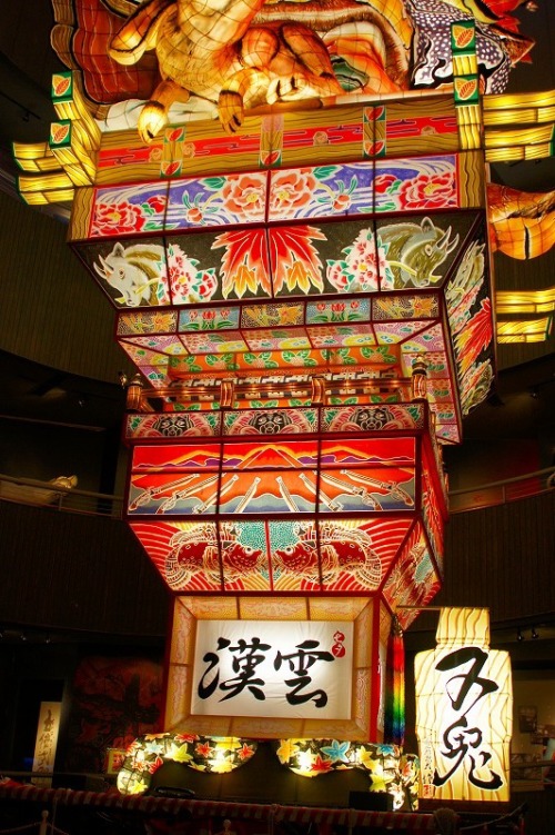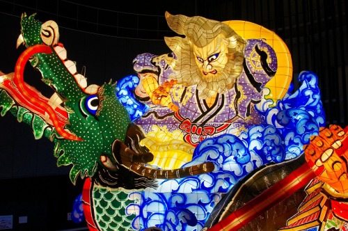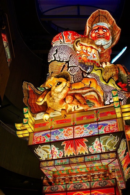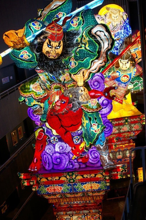 毎年高さ22メートルにも及ぶ立佞武多を この館の中で製作します。 このネブタは2011年の作品です。 義経伝説を題材にしています。 |