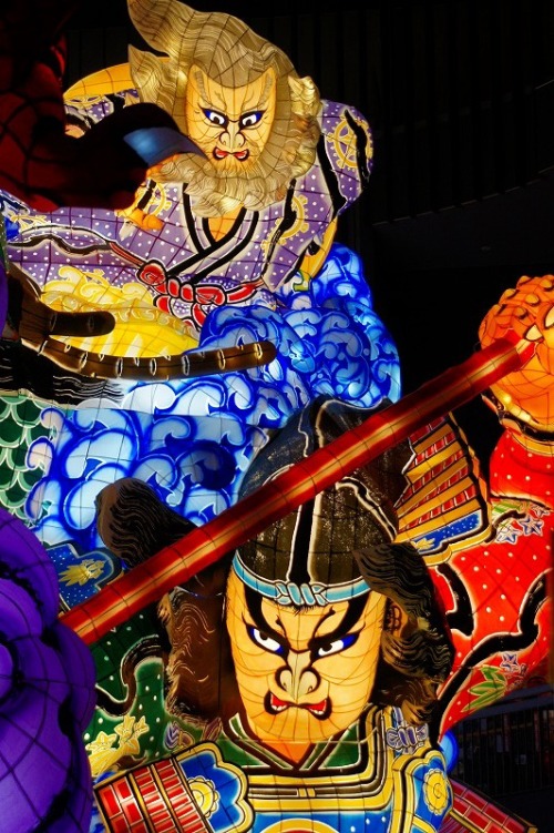 【立佞武多】と呼ばれる、高さ約22m、重さ約17トンの巨大な山車が「ヤッテマレ!ヤッテマレ!」の掛け声のもと、五所川原市街地を練り歩き、その圧倒的迫力で沿道の観客を魅了しています。 |