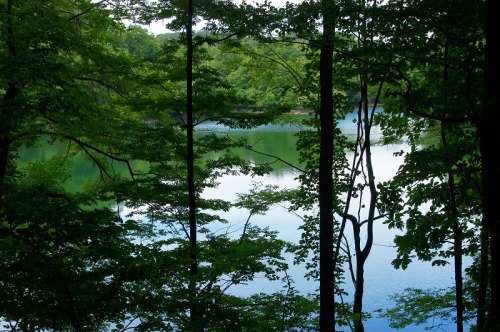 木々の葉の緑と池の濃淡のあるブルーが 何ともいえませんね。 |