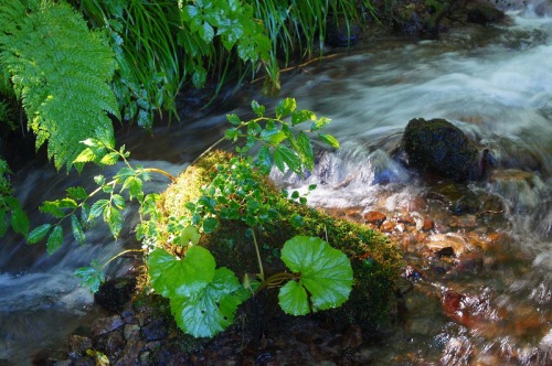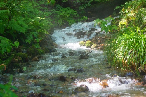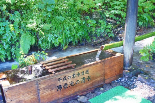 「沸壷の池」から流れ出た清水が「落口の池」へ流れ落ちていきます。 |