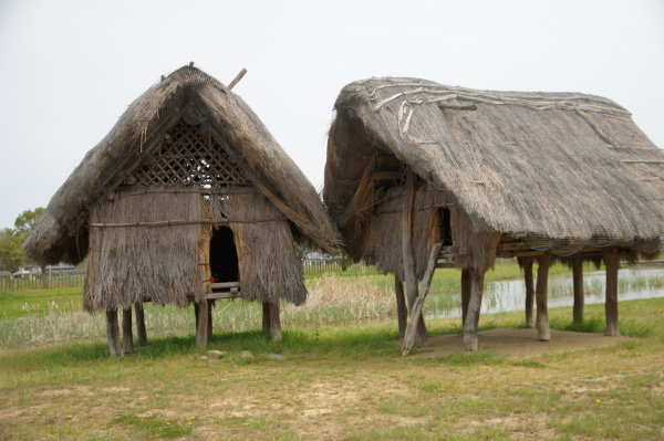 | 出土した柱穴と建築部材であるハシゴ柱、床板などをもとに、高床式住居、高床倉庫を復元。 | |