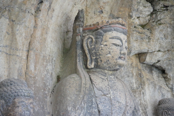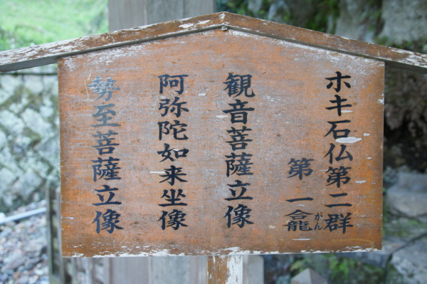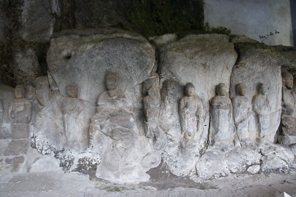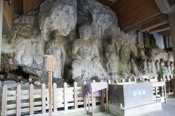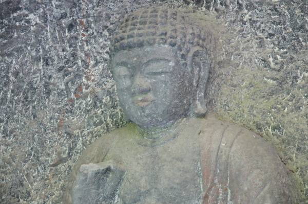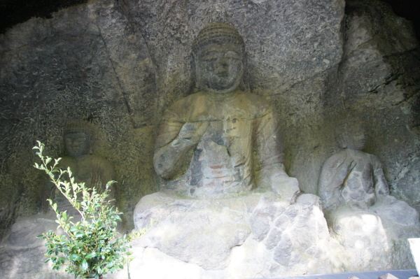 | 第1龕には阿弥陀三尊像が見事な技術で掘り出され、その堂々とした軀体、中尊と両脇侍のそれぞれに異なった豊かな表情など、まことに見事な磨崖仏です。 | |