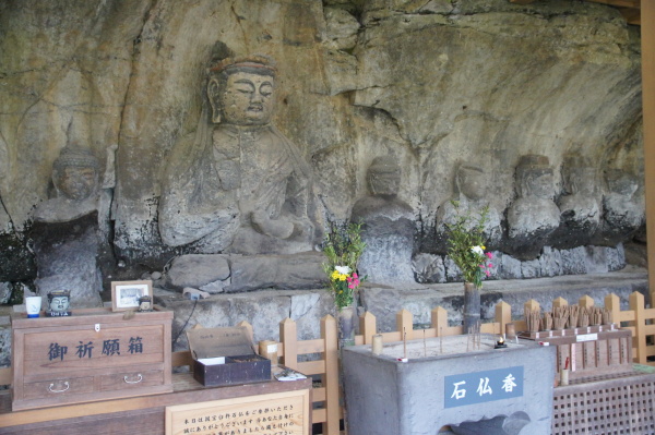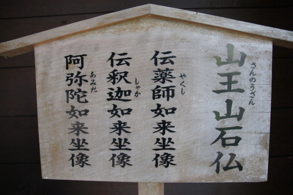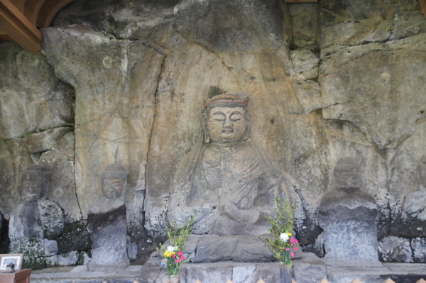 山王山石仏 (さんのうざんせきぶつ) 中央に丈六の如来像と左右に脇侍の様に如来を刻む三体の如来像で構成されています。仏像の顔は輪郭が丸く、目鼻はこじんまりとして童児のそれをおもわせ、今にも語りかけるような口もとなどは、邪気のない純真無垢な童顔そのものです。通称「隠れ地蔵」と言われています |