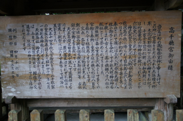 | 高千穂神社(たかちほじんじゃ)は、宮崎県西臼杵郡高千穂町に鎮座する神社である。国史見在社「高智保皇神(高智保神)」の有力な論社であるが、近代社格制度上は村社にとどまった。現在は神社本庁の別表神社となっている。 | |