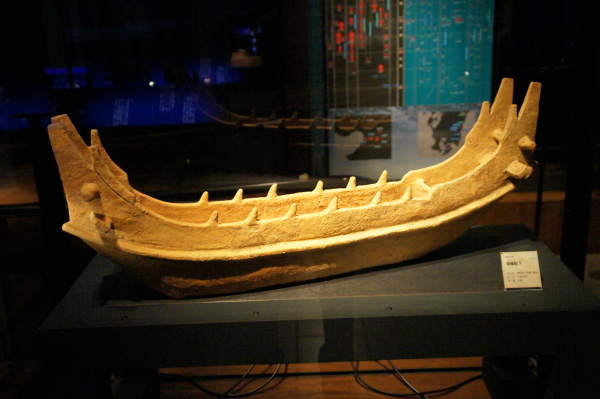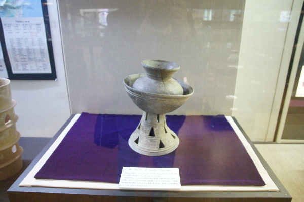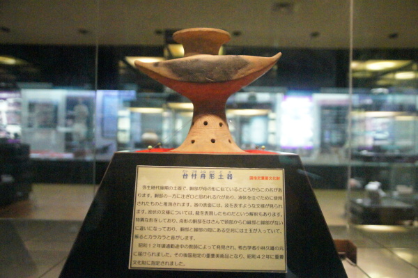 | 台付舟形土器 弥生時代後期(約1800年前)の土器で、その形が舟の形をしているのが特徴です。酒器として使われたと思われ、胴部の端に円形の注ぎ口と考えられる部分があります。 |