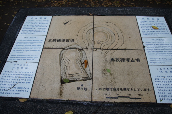 | 墳丘は前方部を南に向けた3段構築で、全長116メートル(前方部長52メートル、後円部直径64メートル)、高さは前方部7メートル・後円部10メートルで、西側のくびれ部に造出しがある。 前方部を行くボラティアガイドと旅仲間 |
