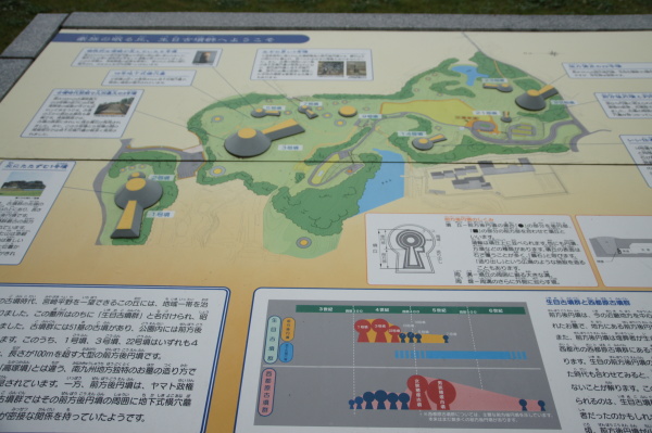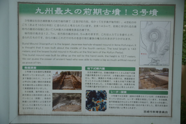 生目古墳群は、宮崎市大字跡江にある丘陵上に築かれた、古墳時代前期から中期(約1700年前から1500年前)の古墳群です。この丘陵は大淀川右岸に位置しており、東には宮崎平野を見渡すことができます。 生目古墳群は51基の古墳で構成されており、公園内には、前方後円墳8基、円墳25基があります。その中の1号墳、3号墳、22号墳は全長が100mを超える規模を誇り、生目古墳群は古墳時代前期において、九州最大の古墳群であったと言えます。 |