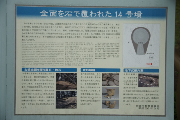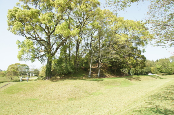 | 女狭穂塚 宮内庁陵墓参考地につき立ち入り禁止 大きさは、全長約180メートル、後円部直径約96メートル、後円部高さ15メートルで、九州地方最大の前方後円墳である。墳丘は三段築成で造られ葺石をともない、周囲には周濠がある。また、くびれ部には造出を持っているため、この特徴から畿内式前方後円墳であることがわかる。築造方法などから、およそ5世紀前半中頃に造られたと推定されている。主体部分である被葬者の埋葬施設は、まだ発掘調査がなされていない。 |