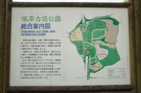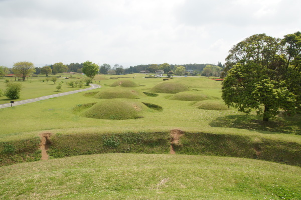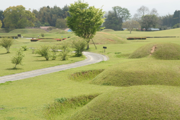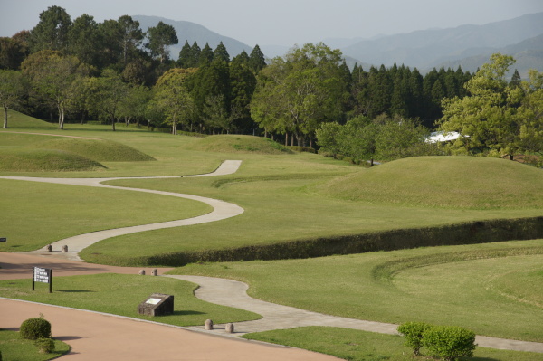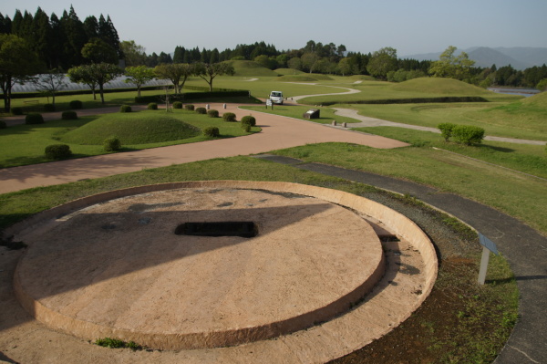 昭和47年(1972)、九州縦貫自動車道開通工事に伴う発掘調査により知られるようになり、自動車は遺跡の下をトンネルで通る形で保存が行われることになりました。 昭和51年国指定史跡となり、昭和61年より史跡公園化の工事が始まりました。約15万平方メートルにおよぶ公園内には、復元された77基の古墳や古墳内部の観察室・古墳の復元模型・竪穴式住居など各所に配置され、野外の古代博物館を散歩している気分にさせられます。 現在確認されている古墳は200余りで、まだ300程の古墳があるだろうと推定されています。公園内には天文台もあり、週末には天体観測も楽しめます。 |