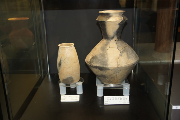 | 免田式土器 土器の形は、胴部がそろばん玉の形のようになっていて、やや開き気味に上に長くのびた円筒状の首 (長頸) をもち、胴部の上半面には、同心円紋を半分に切った紋様(重弧文)やノコギリの歯のような形状の鋸歯紋(三角紋)、短い斜め線の綾杉紋や平行紋を描いています。この土器は、弥生時代に作られたもの中では一番気品があるといわれ、お墓などにお供えされた特別な土器といいます。 |
