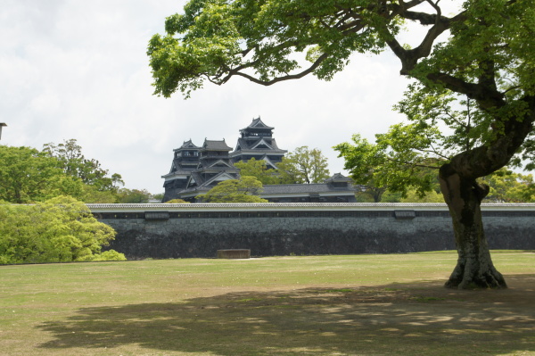 加藤清正が中世城郭を取り込み改築した平山城で、加藤氏改易後の江戸時代の大半は熊本藩細川家の居城。明治の西南戦争の戦場となった。西南戦争の直前に大小天守や御殿など本丸の建築群が焼失し、現在の天守は1960年の再建である |