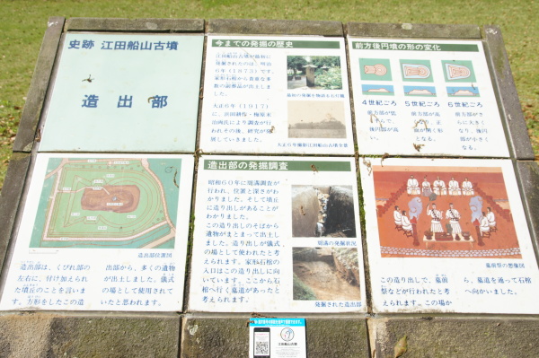| 江田船山古墳(えたふなやまこふん)は、熊本県玉名郡和水町(旧菊水町)に所在する前方後円墳。清原(せいばる)古墳群の中で最古・最大の古墳で、日本最古の本格的記録文書である75文字の銀象嵌(ぎんぞうがん)銘をもつ大刀が出土したことで著名である国の史跡に指定されている。 | |