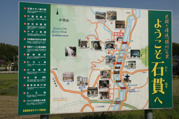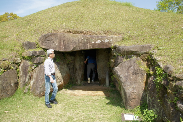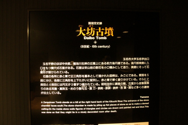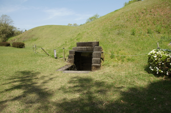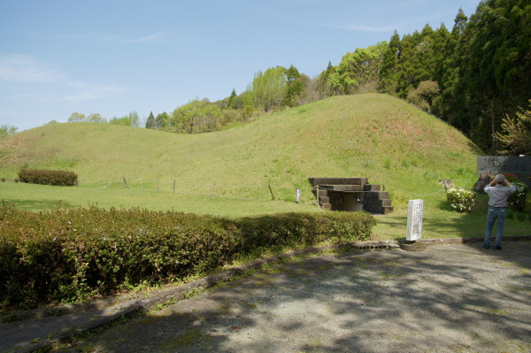 | チブサン古墳 熊本県山鹿市にある全国的に有名な装飾古墳で、全長45m(後円部径24m、前方部幅15.7m)の前方後円墳です。近くにはオブサン古墳、鍋田横穴群、弁慶が穴などが点在しています。 古墳時代6世紀頃に造られたもの。石棺の正面の石板装飾の絵柄が女性の乳房に似ているところから「乳の神様」として現在も信仰が続いています。 ここで大失敗 石室の公開時間が10時だったのですが30分遅れで見られませんでした。 |