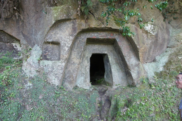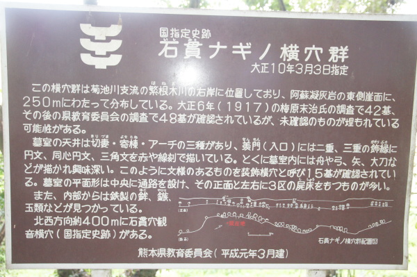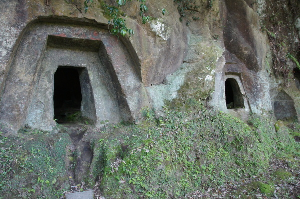 田横穴群は、菊池川と岩野川が合流している場所付近にあります。岩野川の西側に切り立った崖(がけ)があり、崖面に横穴が60基掘られています。 この横穴は何のために造られたのでしょうか。穴の形が家のように見えるので、人が住むところと考えられていたときもありましたが、現在では古墳時代末期の墓ということが分かっています。横穴は凝灰岩(ぎょうかいがん)の崖に掘られています。凝灰岩は岩石のなかでは軟らかく、鉄のみで少しずつ岩を削って、家の形をした大きな穴を完成させています。 |