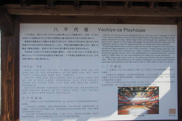 | 八千代座(やちよざ)は、熊本県山鹿市にある芝居小屋。1910年に建設され、1988年に国の重要文化財に指定された。その後復元修理が行われ、2001年に竣工した。 | |