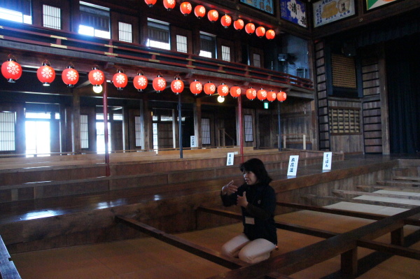 | 客席は舞台に向かって傾斜してます。 ご案内の女性は饒舌で時間が無くなりました。 |