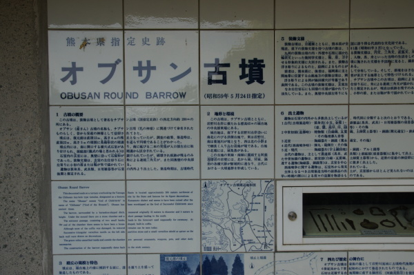 | オブサン古墳は、チブサン古墳の近傍にある円墳である。熊本県の「風土記の丘」構想をもとに、典型的で雄大な横穴式石室として公開できるよう整備を進めることとし、昭和59・60年に熊本県教育委員会が発掘調査を実施した オブサン古墳は6世紀中ごろのチブサン古墳に後続する首長墓で、6世紀後半に築造され7世紀前半まで追葬がなされている。。なお、江戸時代以来、チブサン古墳の壁画図像からくる「乳房信仰」とともに、オブサン(うぶさん=産さん)古墳は「お産」の神様として信仰の対象となり、両者は一体として意識されてきたものである |