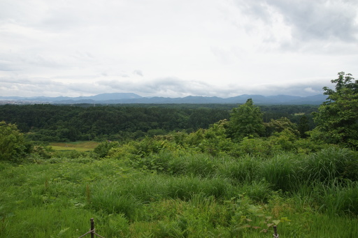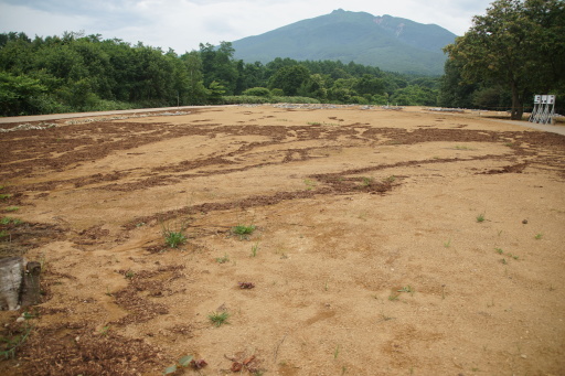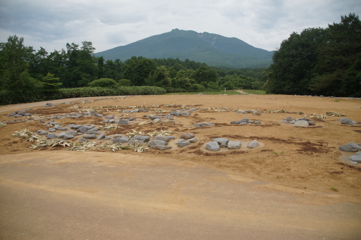 盛土によって整地された台地の背景に岩木山が良く見える。