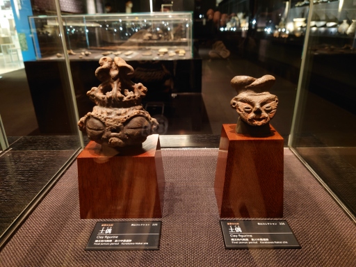 様々な形や顔の表情の土偶がある。 |