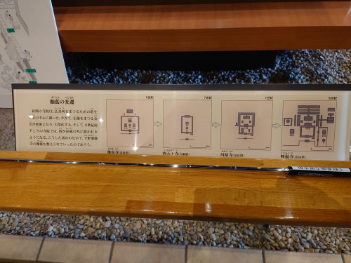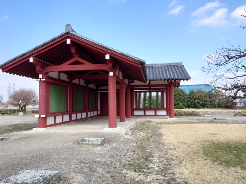 | 250メートル四方の史跡指定範囲の中に回廊跡創建時の塔跡や東基壇跡 西基壇跡に建てられた六角堂等がいられ、回廊の一部が復元されている。 | |