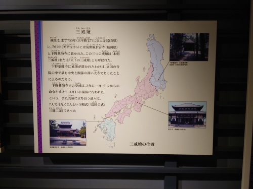 | 古代正式なお坊さんになるための資格試験を受ける場所を「戒壇」といった。この試験を「受戒」と言う。奈良時代この受戒を作ったのは唐の国からはるばる日本にやってきて唐招提寺を開山した鑑真和上さんだ。戒壇はまず奈良の東大寺に置かれその6年後の天平宝字7(761)年に福岡の筑紫観世音寺とともに、この下野薬師寺に置かれた。これを三戒壇と言われている。 | |