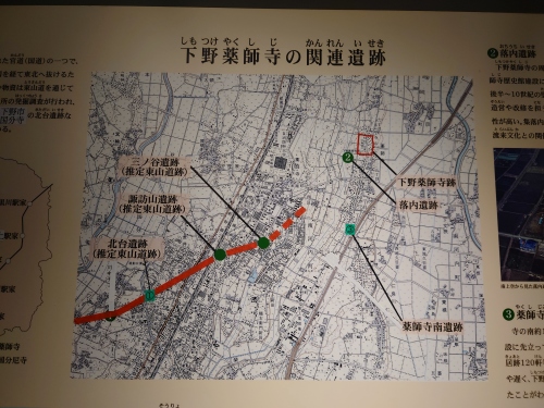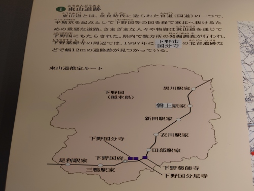 | 東山道は古代官道として整備され下野国と都を結ぶ重要な交通路であった。南西側上野国(群馬県)から足利駅家(うまや)を経て下野国分寺、下野薬師寺を通り北東黒川駅家から陸奥の国へと続いていた。 | |