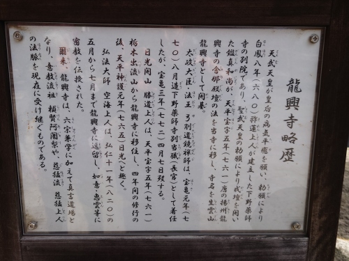 | 龍興寺 略歴下野薬師寺の南方に立ち、同寺の別院とされている。寺伝では奈良時代の天平宝字5年(761年)、鑑真が唐の龍興寺の舎那殿壇の法を移し「生雲山龍興寺」として開基したという | |