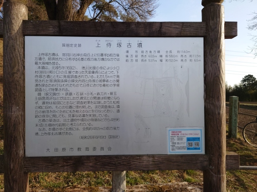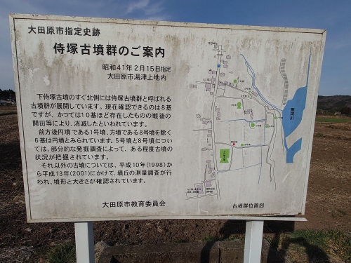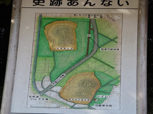 | 上侍塚古墳 説明看板現在上侍塚古墳は「いにしえ栃木発見どき土器わく湧くプロジェクト」事業として侍塚古墳の調査を進めている。折しも、訪れた日は上侍塚古墳の発掘調査が最終日で運がよく墳丘の葺石を埋め戻す前に見ることができた。 | |