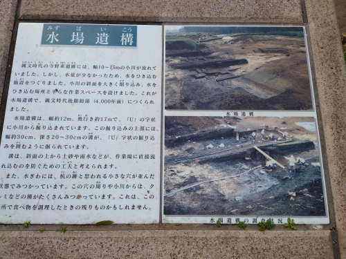 | 後期初頭(4000年前)になると、村の規模は小さくなり、やや低いところに営まれるようになる。このころに水場遺構が造られた。木の実のあく抜きを目的とした、水さらしの施設が見つかったことにより、後期には谷の水を積極的に利用し始めたことがわかる。 | |