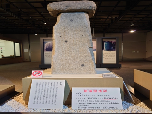 | これが那須国造碑のレプリカです。(大田原市風土記の丘湯津上資料館)石碑の頭に笠が載っているいることから笠石となずけられた。水戸光圀の命により発掘された国造の功績と人となりが記されている国内一級の遺物であると、神社の宮司さんが説明してくれました。 | |