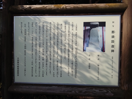 | 那須国造碑は勿論国宝に指定されています。永昌(えいしょう)元年(689)、飛鳥浄御原(あすかきよみはら)の大宮から那須の国造(くにのみやつこ)であった那須直韋提(なすのあたいいで)は評督(こおりのかみ)という評(後の郡)の長官の官職を賜り、その後、庚子(かのえね)の年(700)に亡くなったため後継者の意斯麻呂(おしまろ)らが、碑を立てて故人を偲び祀ったということなどが記されています。 | |