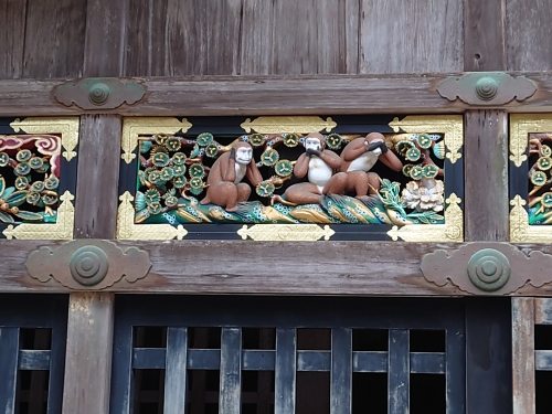 | 神厩舎・三猿(しんきゅうしゃ・さんざる)【重文】神厩舎は、ご神馬をつなぐ厩(うまや)です。昔から猿が馬を守るとされているところから、長押上には猿の彫刻が8面あり、人間の一生が風刺されています。中でも「見ざる・言わざる・聞かざる」の三猿の彫刻が有名です。 | |