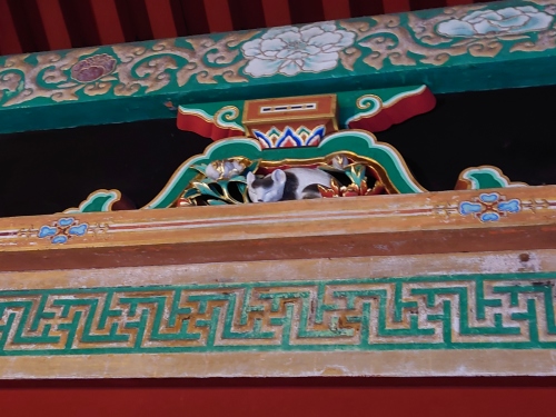 | 眠り猫(国宝)左甚五郎作とつたえられている。牡丹の花に囲まれ日の光を浴び、うたたねをしているところから「日光」に因んで掘られたともいわれている。 | |