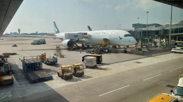 | 今回はHISで飛行機とホテルセットのパックツアーを予約してのパックツアー、JALとキャセイ航空のコード シェア便で機体はキャセイのA350-900だった |