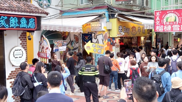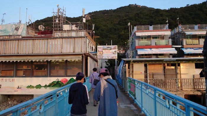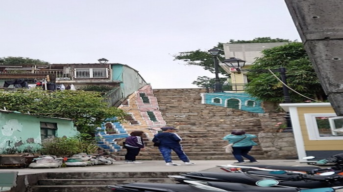 | タイパ・ハウスから官也街に戻る石段にペイントされた偽建築物を撮影する同行者 | ![]() |