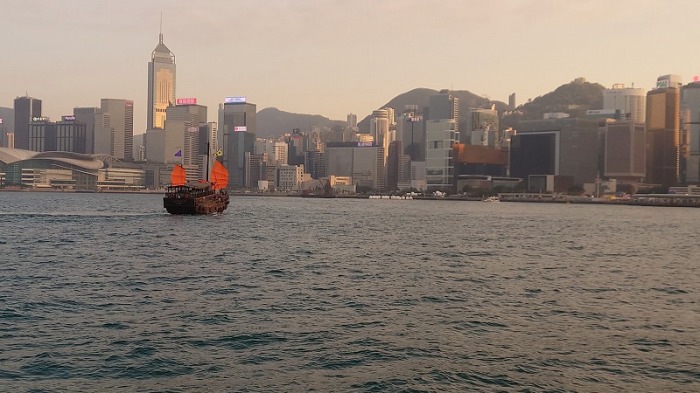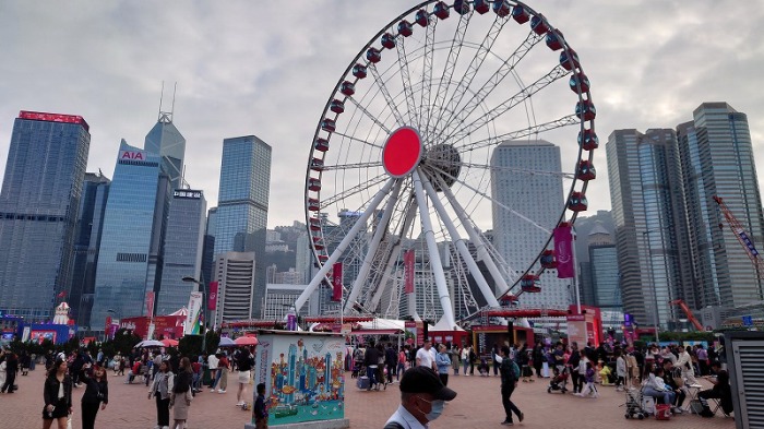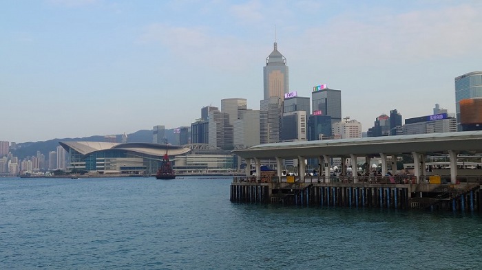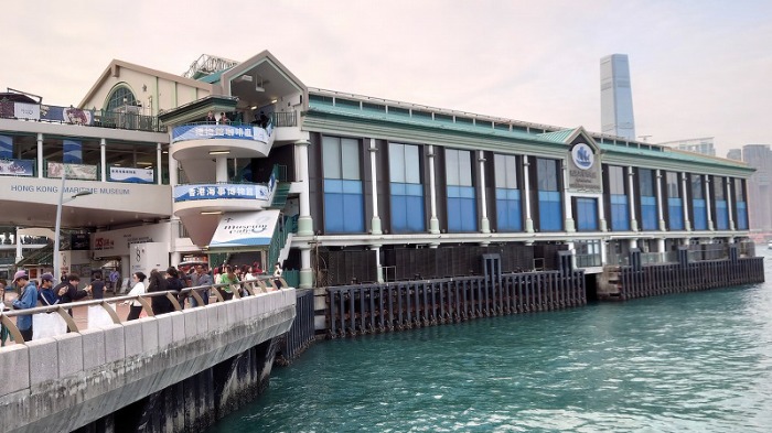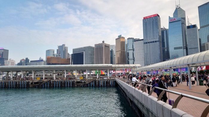 この港は九龍半島チムサアチョイから香港島にわたるフェリーの乗り場桟橋もありますから結構な 沢山の人達が集まってきます |