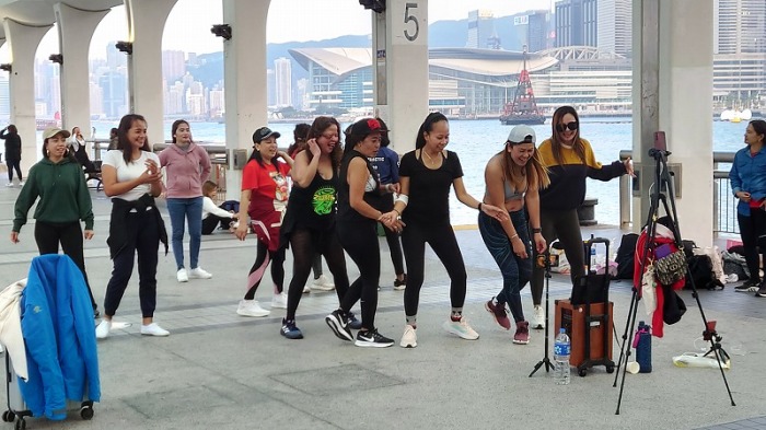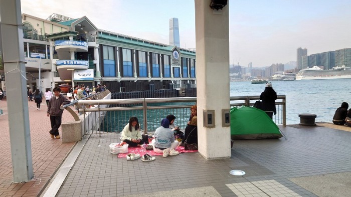 | 香港では共稼ぎが一般的で中流以上の家庭はお手伝いさんを雇用してます その多くが東南アジアからきている出稼ぎの人達で休日は家庭の両親が家にいるために お手伝いさんは家から追い出されるそうでこうした人たちが仲間と集まって つかの間のひと時を過ごしているらしいです |