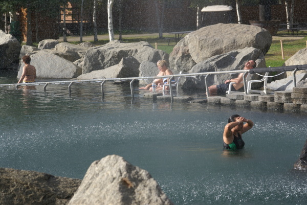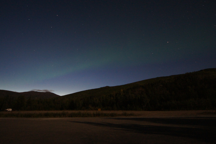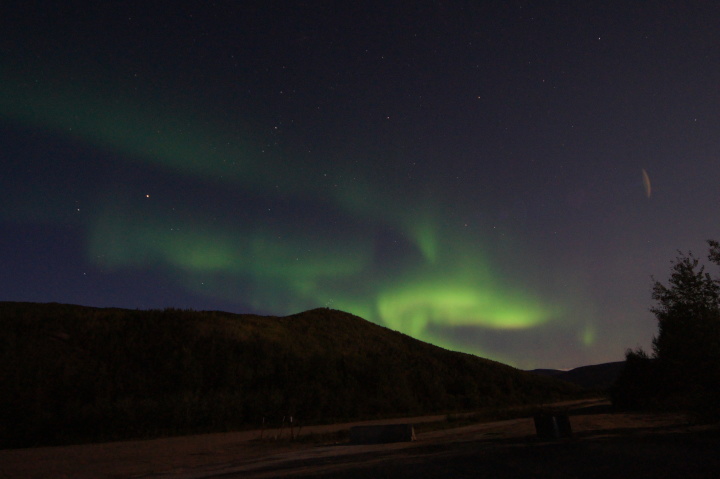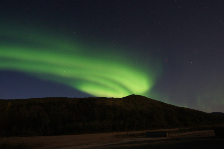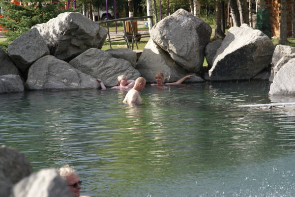 | 夜10時過ぎにチェナ温泉のロッジに到着しました。 まだ空は明るいですよ! ただしこの日は雲がべったりで 到底オーロラにはお目にかかれそうにありませんでした。 早々に水着に着替えて入浴です。 |