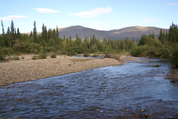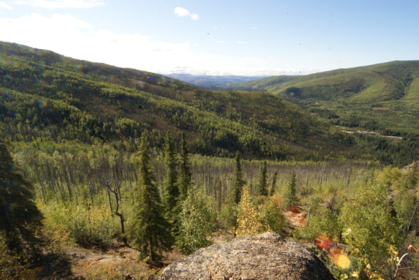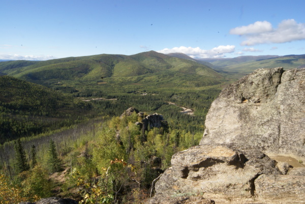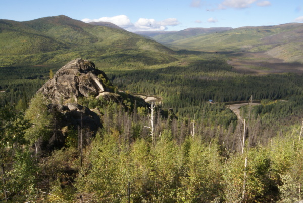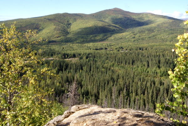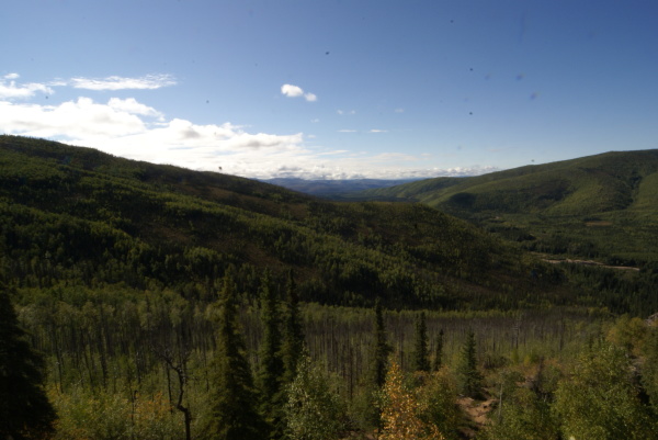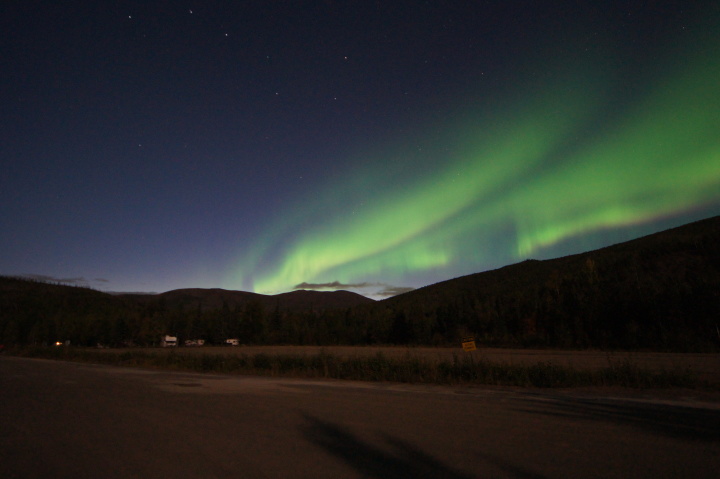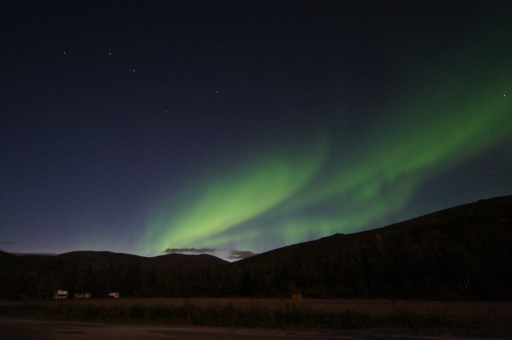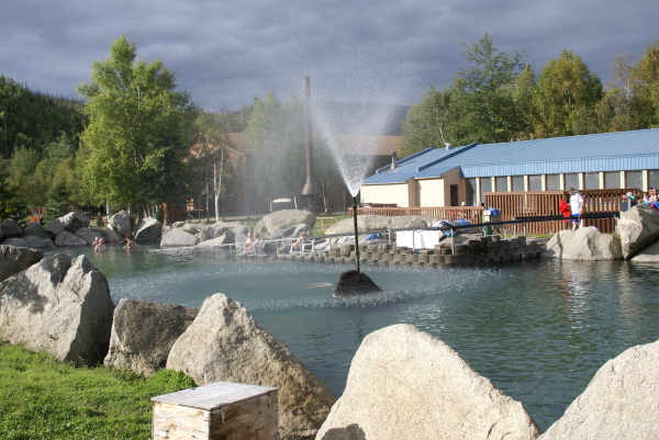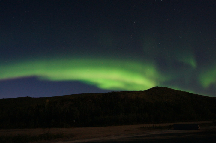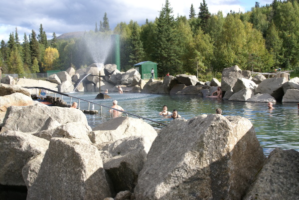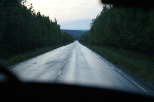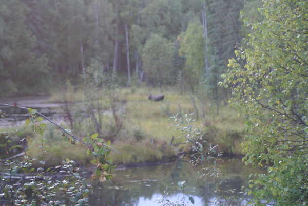 アラスカ鉄道フェアバンクス駅に午後八時半に到着、車で60マイル(96キロメートル)はなれたチェナ温泉に向かいました。フェアバンクスは雨でしたがチェナに近づくにつれて雨はあがってきました。
