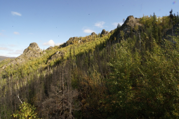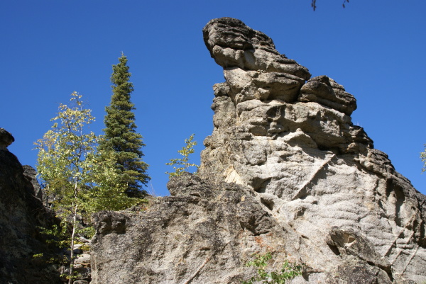 | 今にも崩れ落ちそうな岩もあります。 割れ目に溜まった水が凍結を繰り返して岩の割れ目が大きくなって崩れ落ちるのだそうです。 |
