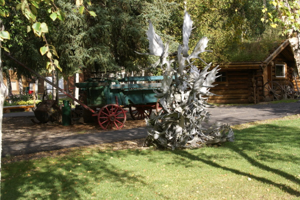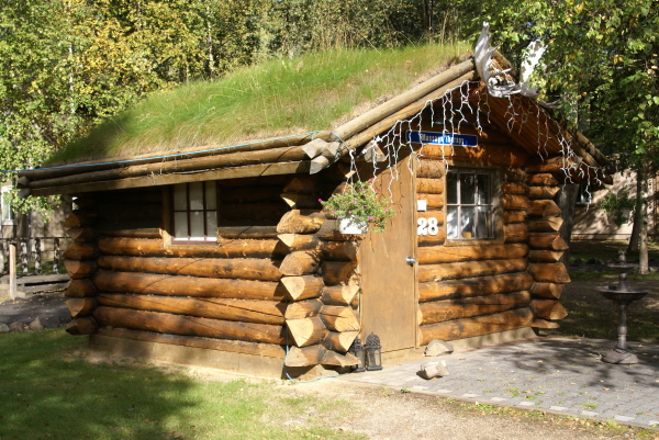 | ムースの角を屋根にかあった ログハウス。 |