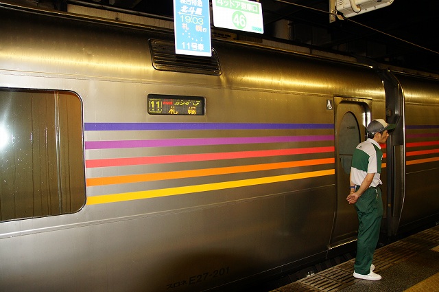 | 札幌駅に定刻9時32分到着 数日前の大雨で函館本線が不通でした、ぎりぎりカシオペアは21日に札幌から上野へ戻ってきたので我々は乗ることができました そんなことで函館本線では事故現場を徐行運転したので途中6分ほど遅れてましたが、札幌到着は取り戻して定刻に到着 |