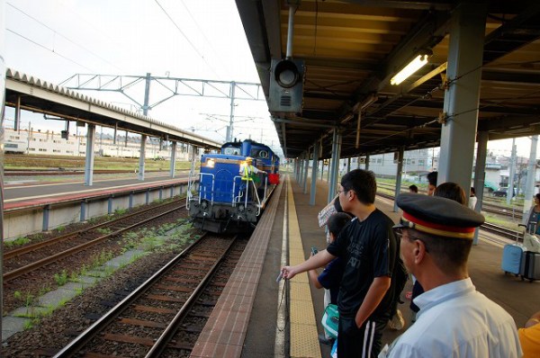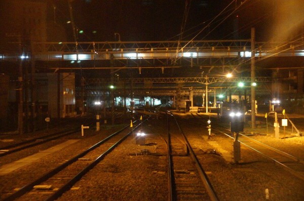 | 深夜1時50分青森駅着 2時47分発 青森駅を出たところ 停車中に機関車が変わります 客車の前後が逆転して一号車が先頭で機関車の後ろに 連結されます この写真は12号車の展望車から撮影したものです |