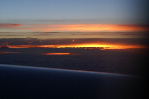 | シアトルには19日(日付変更線通過)のAM8時55分でした。この写真は到着前の太平洋上空の夜明けです。 機上にて |