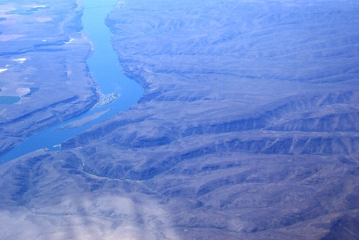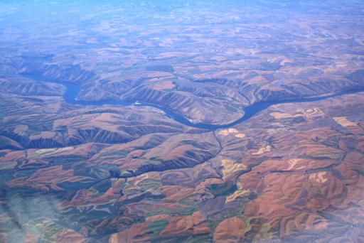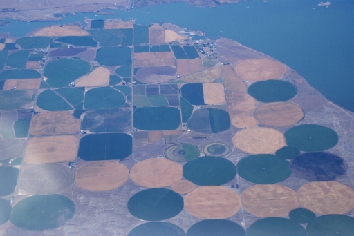| 機上から どうして畑が円形なのか? ロス在住の方から教えていただきました。 「アロノア砂漠で灌漑用の放水のため、円の中心から1本の管(穴のあいた)が出ていてそれがぐるぐるまわって放水しているため円形だそうです。」 |